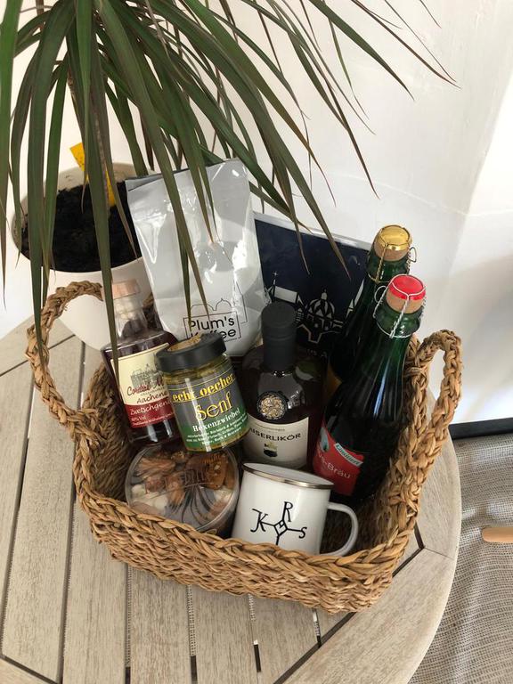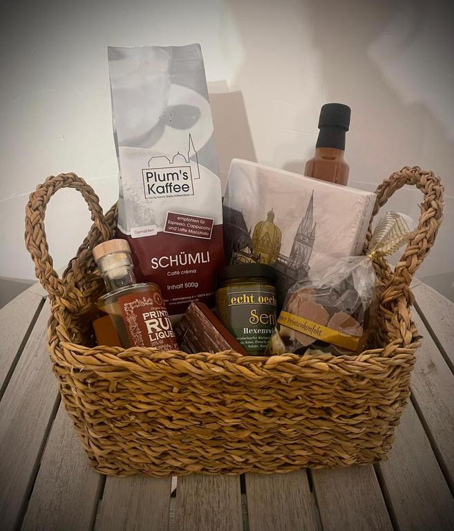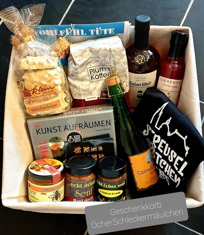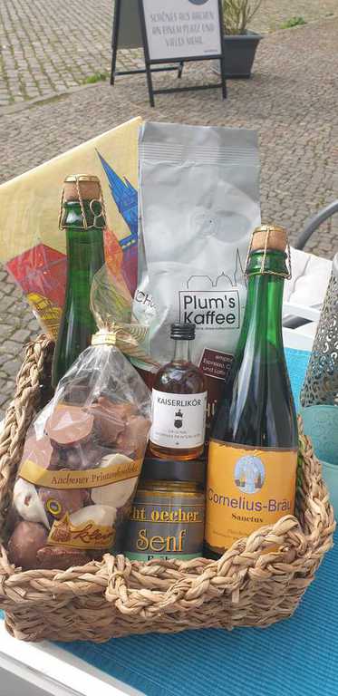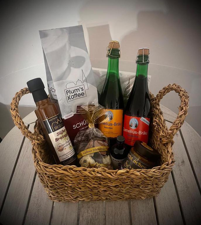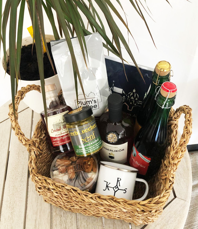 Lasst uns gemeinsam euren Geschenkkorb für eure Liebsten füllen. Individuell, egal ob traditionell mit Printen, Corneliusbräu und Plums Kaffee oder auch neues wie Öcher Senf und Domlikör.